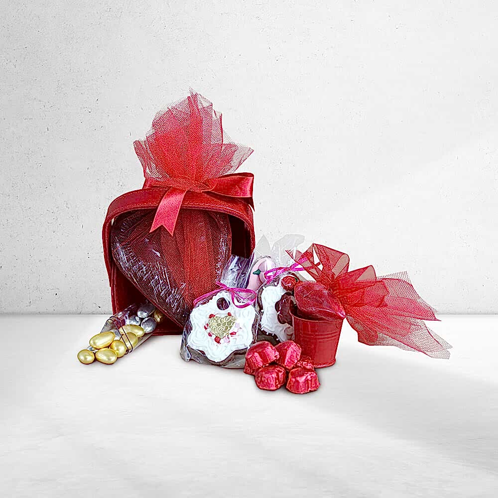 Büyük kalp çikolata 1 adet çiftli , dudak çikolata 1 adet yaldızlı mini kalp 70gr , sevgililer günü kurabiyesi 3 adet , 1 adet tilayt mum ve kovası, 85 gr Mini kutu draje 2820 TL